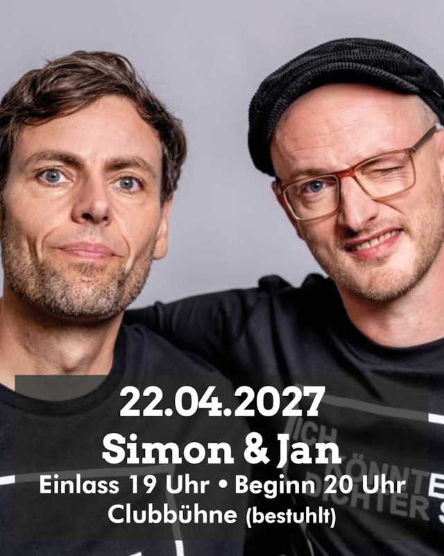 Aktuelle Veranstaltungen Simon & Jan - Heiße Luft 22.04.2027 Tickets ab 29,60 EUR Duo Stiehler / Lucaciu 22.04.2027 Tickets ab 28 EUR Bernd Kohlhepp und Uli Boettcher 22.04.2027 Tickets ab 27 EUR Marcel Kösling - „Moment Mal!“ 22.04.2027 Tickets ab 26 EUR Mathias Tretter - Souverän 22.04.2027 Tickets ab 22,50 EUR Lars Redlich 22.04.2027 Tickets ab 25,20 EUR Letzt Zep 22.04.2027 Tickets ab 38,58 EUR Maxi Gstettenbauer - KOMPLETT ABSURD 22.04.2027 Tickets ab 32 EUR Buonomemes 22.04.2027 Tickets ab 30 EUR Ein Live-Hörspiel von Josef Ulbig | Lauscherlounge 22.04.2027 Tickets ab 38,40 EUR Hendrik Brehmer 22.04.2027 Tickets ab 29,15 EUR Skerryvore - Beacon of Scot Rock 22.04.2027 Tickets ab 35,10 EUR PaginierungErsteVorherige1…64956496649764986499…6636NächsteLetzer